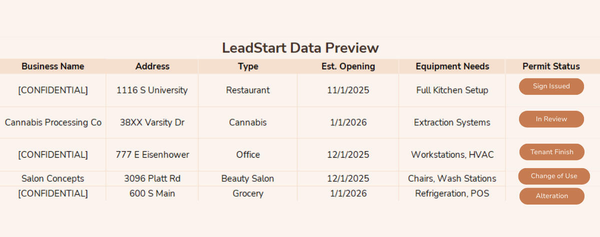 By the time a new business shows up on Google Maps, they’ve already bought their equipment. LeadStart Data alerts you when permits are filed—before the signs go up.